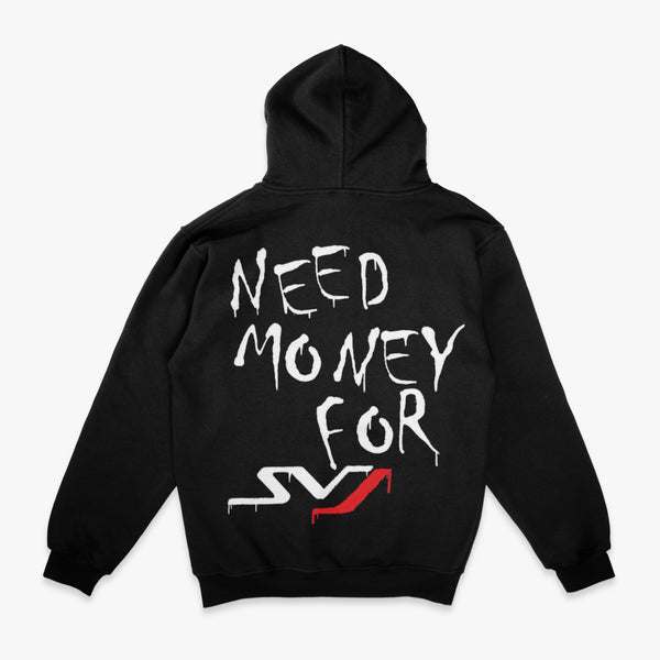 Introducing the “NEED MONEY FOR SVJ” Black/Red Hoodie, a Hoodie crafted from luxury ultra heavyweight fabric. It features our Signature Smurf Racing Logo in Red on the front an “NEED MONEY FOR SVJ” scripted design on the back.
